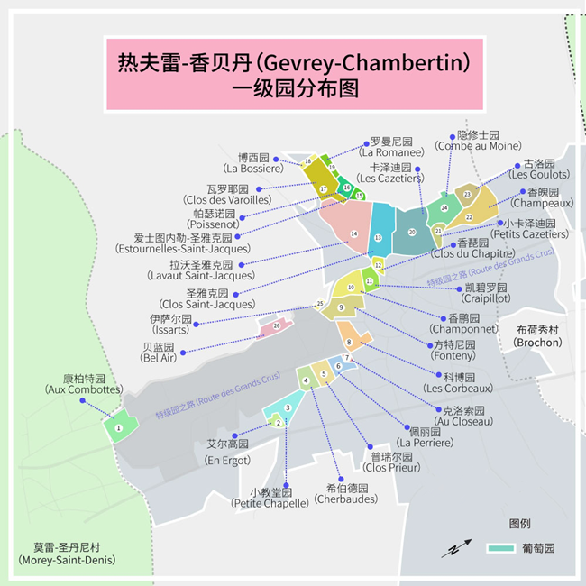 此外,勃艮第還有數個大大小小的村莊,不同村莊衍生出了不同的法定產區,各個村莊獨特的風土也為這些村莊刻上不同標簽。比如,提到熱夫雷-香貝丹(Gevrey-Chambertin),就會讓人想到強勁、飽滿、豐富和堅實的結構,以及極強的陳年能力。提到香波-慕西尼(Chambolle-Musigny)就讓人想到優雅與精致。
