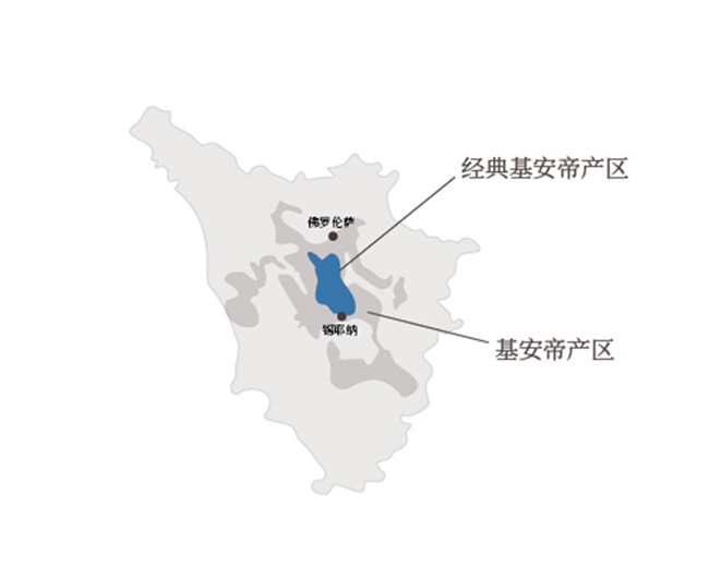 經(jīng)典基安帝產(chǎn)區(qū)地處托斯卡納(Tuscany)大區(qū)中部的佛羅倫薩市(Florence)與錫耶納市(Siena)之間,總占地7萬余公頃,在行政區(qū)域上涉及9個市鎮(zhèn),涵蓋了拉達(Radda in Chianti)、佳奧利(Gaiole in Chianti)、卡斯特里納(Castellina in Chianti)和格里弗(Greve in Chianti)這四個市鎮(zhèn)的全部地域以及其余5個市鎮(zhèn)的部分地域。