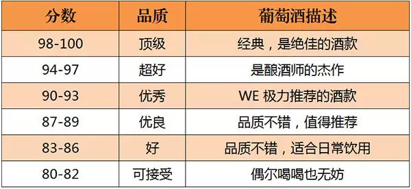 美國的《葡萄酒與烈酒》(Wine & Spirits)雜志是世界上最權威的葡萄酒雜志之一。自 1994年起,《葡萄酒與烈酒》也開始采取百分制對葡萄酒進行評分,葡萄酒首先會經過一些葡萄酒專業(yè)人士進行初次品嘗篩選,之后才會送到專業(yè)“評酒團”品評,所以該雜志評分的葡萄酒品質都不錯。評分標準如下所示: