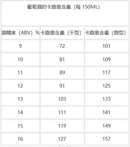 葡萄酒的熱量與其所含的酒精度息息相關(guān)(參考下表),因此不能簡(jiǎn)單地用白葡萄酒、紅葡萄酒來做比較。