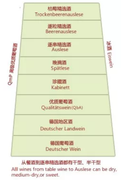 高級優(yōu)質葡萄酒是德國葡萄酒質量等級的最高級別,如果按照德文Qualitatswein mit Prädikat逐字翻譯即為:“具有優(yōu)異特性的高級葡萄酒”,簡稱QmP。酒莊出產(chǎn)的每批QmP葡萄酒都要通過德國官方檢測,并且不允許補糖。