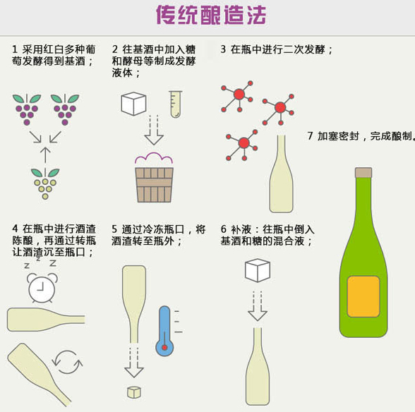 采用傳統(tǒng)釀造法釀制的起泡酒有很多,香檳就是其中之一。除此之外,還有香檳之外的其它法國(guó)起泡酒、西班牙的卡瓦以及意大利的弗朗齊亞柯達(dá)等。