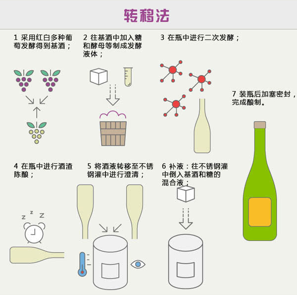 轉(zhuǎn)移法和傳統(tǒng)釀造法在初期階段極為相似,不過(guò)前者在瓶中發(fā)酵完成后,會(huì)轉(zhuǎn)移至不銹鋼灌中進(jìn)行澄清,完成剩余步驟,然后再重新裝瓶。