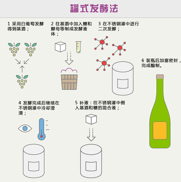 罐式發(fā)酵法,又稱查瑪法,是一種源自意大利的起泡酒釀造法。顧名思義,罐式發(fā)酵法指的就是基酒的二次發(fā)酵是在不銹鋼罐中進(jìn)行。普羅塞克和阿斯蒂這兩種意大利最知名的起泡酒就是采用這種方法釀制。