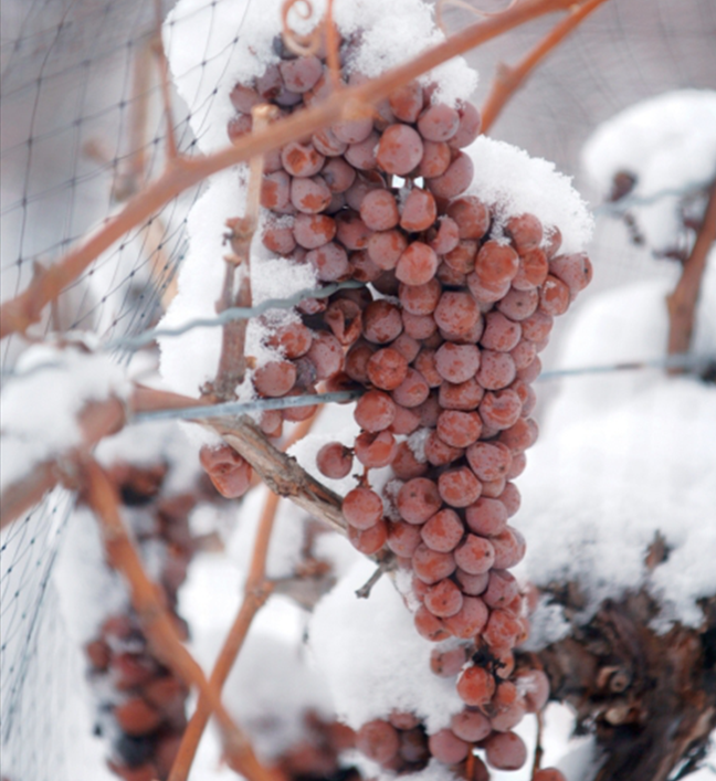 風(fēng)干葡萄將“濃縮就是精華”奉為真理,冰葡萄則用冰霜鎖住精華。在寒冷地區(qū),種植者們會(huì)將葡萄留于枝頭,成串結(jié)冰,直至嚴(yán)冬在夜間進(jìn)行采收。冰葡萄硬度大,壓榨時(shí)需要施加較大壓力,榨出來(lái)的葡萄原汁僅有正常收獲葡萄的五分之一,卻濃縮了很高的糖分、酸度和風(fēng)味物質(zhì)。最終的成酒沒(méi)有風(fēng)干葡萄酒那樣不加掩飾的奔放香氣與厚重酒體,而是以清潤(rùn)甜美的風(fēng)格自成一派。