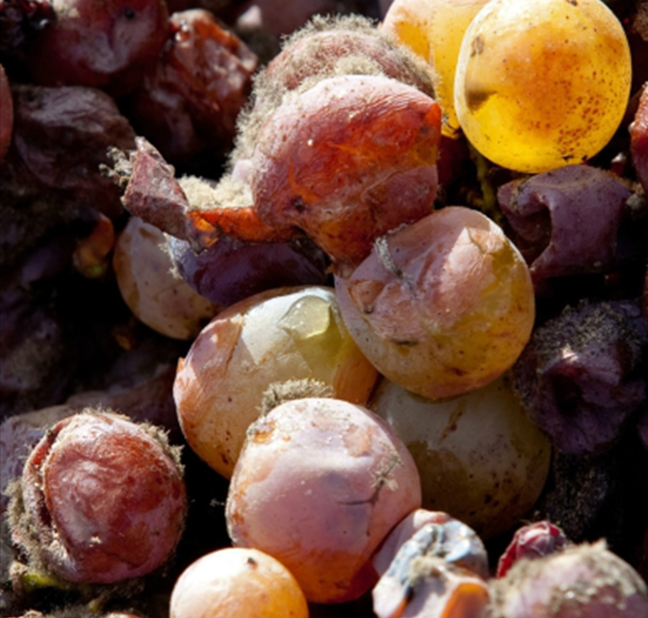 如圖所示,貴腐葡萄身形干癟,表皮還伴有細(xì)細(xì)的菌絲,若對(duì)該類(lèi)葡萄沒(méi)有了解,定會(huì)認(rèn)為這是發(fā)了霉的爛葡萄,但到了葡萄農(nóng)這兒,它就是彌足珍貴的釀酒原料。要成為貴腐葡萄,被灰葡萄孢菌(Botrytis Cinerea)侵染是第一步,但灰葡萄孢菌“亦正亦邪”,在適當(dāng)條件下,它可以轉(zhuǎn)化為有益的貴腐菌(Noble Rot),反之則有可能化身為誘導(dǎo)果實(shí)腐爛變質(zhì)的灰腐菌(Grey Rot)。因此,健康果實(shí)感染灰葡萄孢菌的“造化”就全憑清晨是否潮濕多霧、午后是否晴朗干燥來(lái)決定了。成功被貴腐菌侵染的葡萄表皮穿孔、水分蒸發(fā),糖分、酸度以及風(fēng)味物質(zhì)高度濃縮,與風(fēng)干葡萄有著異曲同工之妙,卻比風(fēng)干葡萄產(chǎn)量更低、更加難能可貴。