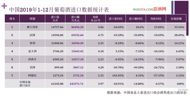 近日,中國食品土畜進(jìn)出口商會酒類進(jìn)出口商分會發(fā)布了來自中國海關(guān)的2019年度中國進(jìn)口葡萄酒統(tǒng)計數(shù)據(jù)。2019年中國進(jìn)口葡萄酒總量為61245.88萬升,進(jìn)口總額為24.3371億美元,分別相比2018年下降了10.91%和14.8%。進(jìn)口葡萄酒均價為3.97美元/升,同比2018年度下降了4.57%。