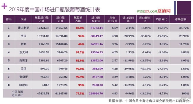 排名第一的澳大利亞瓶裝葡萄酒進(jìn)口總量為12221.38萬升,進(jìn)口總額為8.1763億美元,相比2018年分別增長2.44%和13.05%。進(jìn)口均價為6.69美元/升,相比2018年增長了10.36%。占據(jù)了35.72%的市場份額。相比2018年度27.1%的市場份額,增長了近32%。