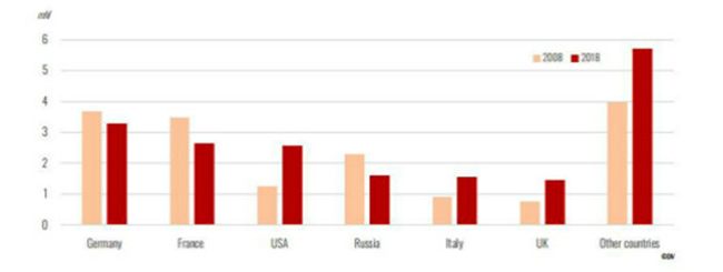 2008年-2018年期間,美國、俄羅斯、英國的平均年度增長率分別為11%、7%、6%。