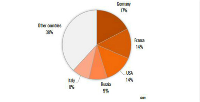 全球主要起泡酒出口市場:意大利(3.9億升)、法國(1.9億升)、西班牙(1.8億升)、其它國家(1.3億升)。