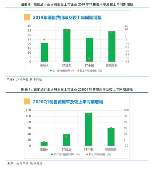 2020年第一季度,張裕銷售費用率顯著下降,為四家上市企業(yè)中最低,主要由于新冠肺炎疫情嚴重影響公司營銷活動減少。不僅僅是張裕,其他三家銷售費用均受疫情影響大幅下滑,所以其他三家高企的銷售費用率及增幅,并不是品牌和渠道建設上的大手筆投入增加,而是銷售費用的下滑幅度并沒有追上其營收的下滑幅度所致。