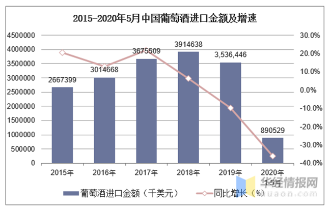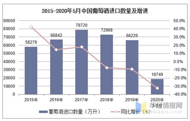 2015-2020年5月中國葡萄酒進口數(shù)量及增速