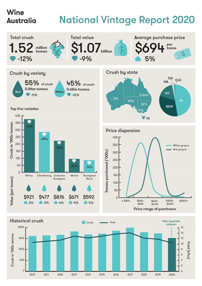 釀酒葡萄的出售總額預(yù)估為10.7億澳元,平均價格達(dá)到了694澳元/噸,高于2019年的663澳元/噸。
