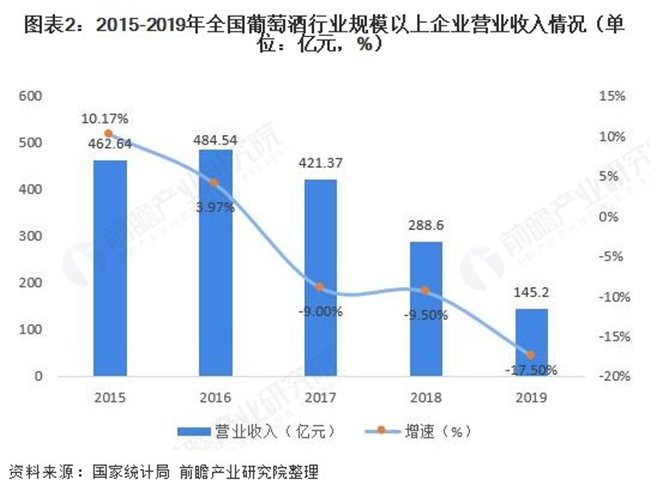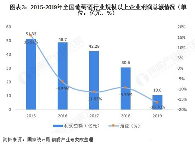 在營業(yè)收入與利潤總額方面,全國葡萄酒行業(yè)規(guī)模以上企業(yè)已經(jīng)連續(xù)三年“雙降”。2019年全國葡萄酒行業(yè)規(guī)模以上企業(yè)實(shí)現(xiàn)營業(yè)收入145.2億元,同比下滑17.5%;實(shí)現(xiàn)利潤總額10.6億元,同比下滑16.7%。