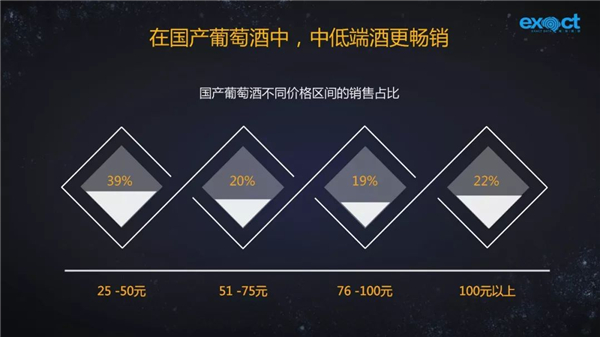 從消費(fèi)市場來看,國產(chǎn)葡萄酒銷量占比最大的價格區(qū)間集中在25-50元,其次是51-75元、76-100元。單價100元以內(nèi)的占據(jù)國產(chǎn)葡萄酒市場近八成。