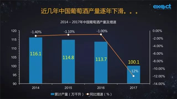 從統(tǒng)計(jì)數(shù)據(jù)看,2014-2017年,中國葡萄酒產(chǎn)量呈逐年下滑態(tài)勢。2017年中國葡萄酒產(chǎn)量為100.1萬千升,同比下滑12%。據(jù)業(yè)內(nèi)人士認(rèn)為,中國葡萄酒正處于調(diào)整優(yōu)化期,劣質(zhì)產(chǎn)能下滑,優(yōu)質(zhì)產(chǎn)能上升。一方面,進(jìn)口品牌對中國葡萄酒產(chǎn)業(yè)造成巨大沖擊;另一方面,低端低價競爭把國產(chǎn)葡萄酒逼入死胡同。