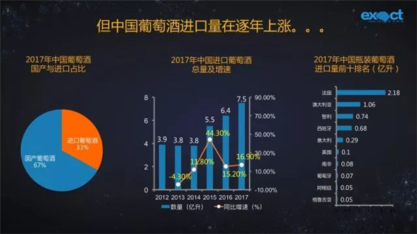 據(jù)統(tǒng)計(jì)數(shù)據(jù)顯示,2017年,中國消費(fèi)的葡萄酒中約1/3來自于進(jìn)口,進(jìn)口總量為7.5億升,同比增長16.9%。其中七成多為瓶裝葡萄酒。從進(jìn)口來源國來看,中國進(jìn)口葡萄酒主要來自于法國、澳大利亞、智利、西班牙。
