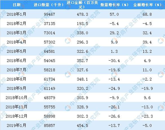 從金額方面來(lái)看,2013年-2014年中國(guó)葡萄酒進(jìn)口金額有小幅度下降,2015年-2018年中國(guó)葡萄酒進(jìn)口金額增長(zhǎng);2019年1月中國(guó)葡萄酒進(jìn)口金額為454.5百萬(wàn)美元,同比下降5%。