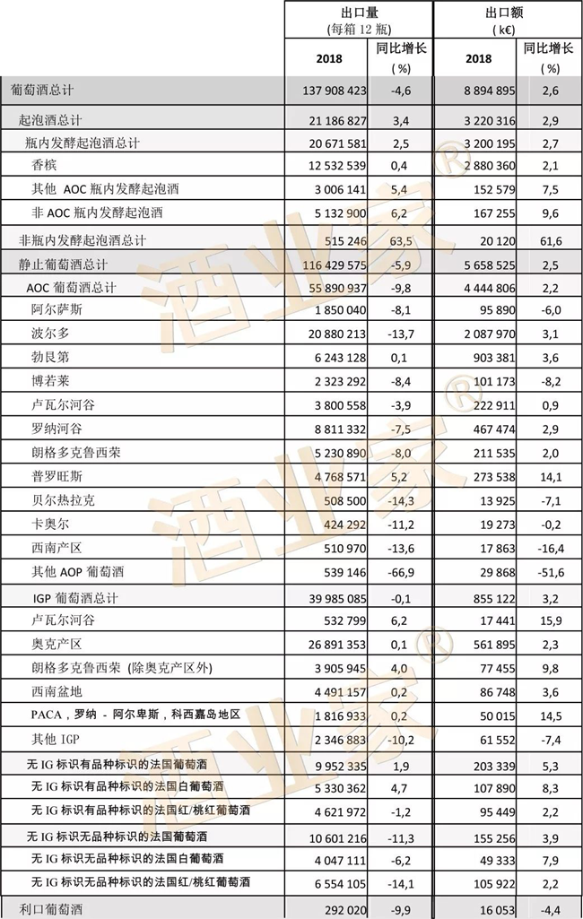 據(jù)FEV S(法國葡萄酒及烈酒出口商聯(lián)盟)發(fā)布的2018年法國葡萄酒與烈酒出口報告顯示,2018年法國 對外出口量下降2.7%,至1.93億箱; 出口額增長2.4%,超過132億歐元。