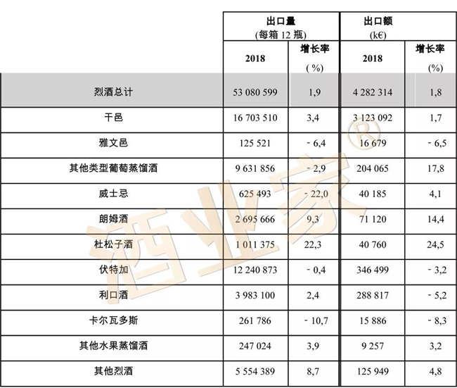 法國烈酒出口保持著健康的增長,出口額增長了1.8%,達(dá)到42.82億歐元; 出口量增加1.9%,達(dá)到5308千萬箱。