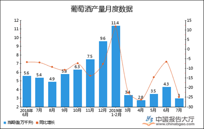 根據中國報告大廳對2019年1-7月全國葡萄酒產量進行監測統計顯示:2019年7月全國葡萄酒產量3萬千升,同比下降25%,2019年1-7月全國葡萄酒產量為23.7萬千升,累計下降23.1%。