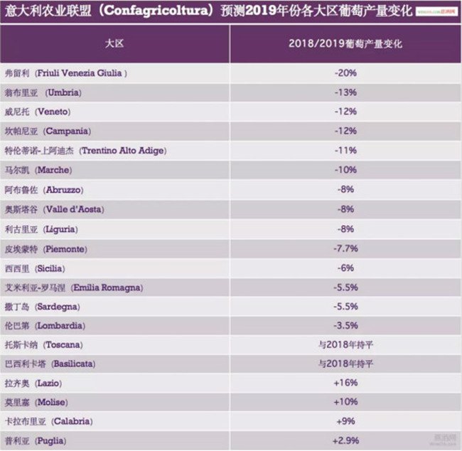 意大利農(nóng)業(yè)聯(lián)盟(Confagricoltura)研究中心也主要針對2019年意大利各大區(qū)的葡萄產(chǎn)量進行了預(yù)測。在分析了來自個大區(qū)主要葡萄酒產(chǎn)區(qū)的代表性酒莊的葡萄樣本之后,意大利農(nóng)業(yè)聯(lián)盟(Confagricoltura)研究中心認(rèn)為,2019年,意大利大部分地區(qū)的葡萄產(chǎn)量都將出現(xiàn)不同程度的下降。其中弗留利(Friuli Venezia Giulia )大區(qū)的葡萄產(chǎn)量降幅最大,預(yù)計將比2018年減少20%。翁布里亞、威尼托、坎帕尼亞、特倫蒂諾-上阿迪杰、皮埃蒙特、艾米莉亞-羅馬涅等大區(qū)在2019年的葡萄產(chǎn)量都將出現(xiàn)不同程度的降幅。