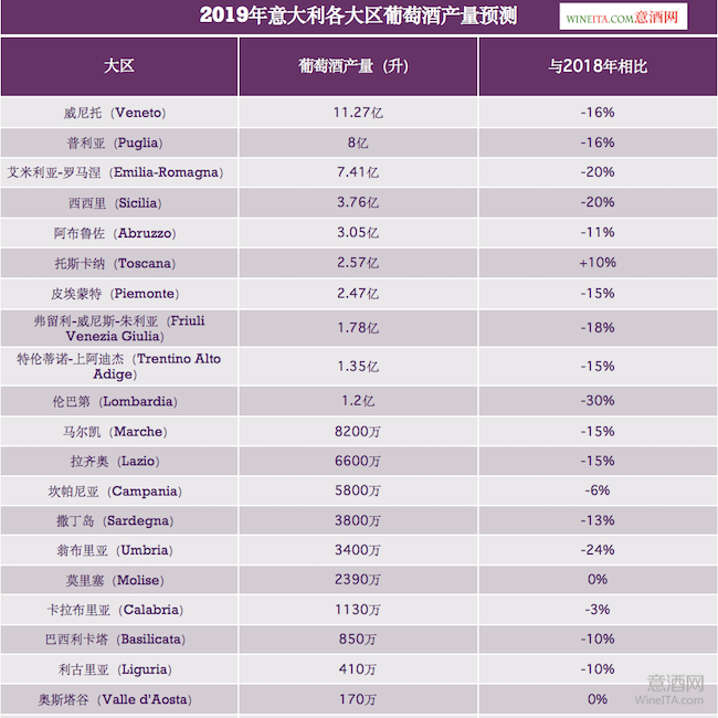 根據(jù)目前的預測,在所有大區(qū)中,2019年份葡萄酒產(chǎn)量最高的將是威尼托(Veneto)大區(qū),預計達到11.2億升,將比2018年減少16%。第二、第三位依次是普利亞(Puglia)大區(qū)和艾米利亞-羅馬涅(Emilia-Romagna)大區(qū),葡萄酒產(chǎn)量預計分別將達到8億升和7.41億升。