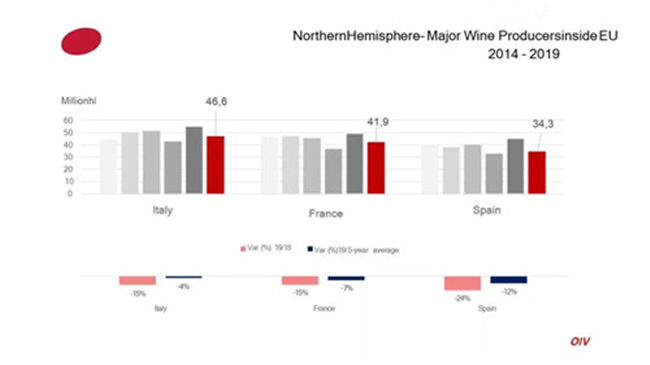 包括法國、意大利、西班牙在內的葡萄酒主產國產量均有不同程度下降。OIV的數據來自28個國家,占全球葡萄酒產量的85%。