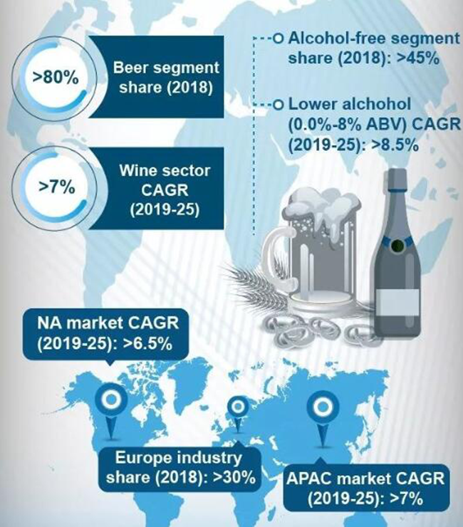 根據(jù)全球市場洞察(Global Market Insights)2019年發(fā)布的報告,2018年無醇葡萄酒和無醇啤酒市場規(guī)模為200億美元,預(yù)計從2019年到2025年,年復(fù)合增長率將超過7%,達(dá)300億美元,以下是部分?jǐn)?shù)據(jù):