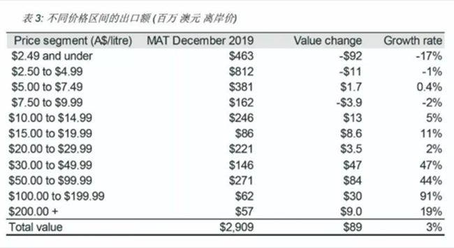 與許多主要市場的趨勢一致,低價位的澳大利亞葡萄酒出口額呈下降趨勢,高價位的則呈現上升趨勢(見表3)。