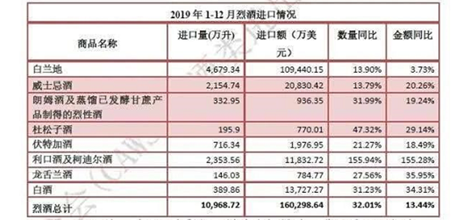2月25日,中國食品土畜進出口商會酒類進出口商分會發布《2019年全年酒類進口數據》。數據顯示,019年1-12月,烈酒進口量1.1億升,同比增長32%;進口額16.億美元,同比增長13.4%。烈酒在過去的一年里,一路逆市飄紅,統計在內的各烈酒酒種全部實現量額齊增。