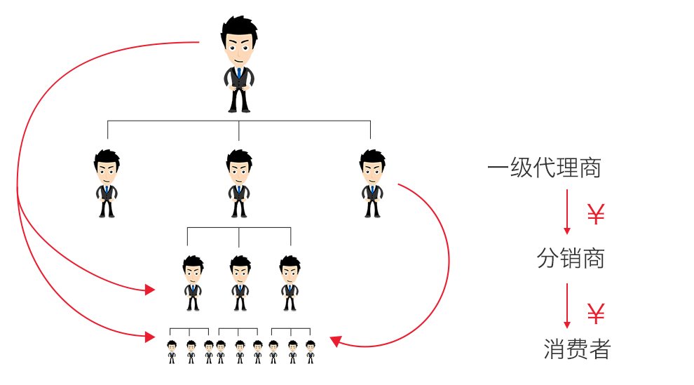 三級分銷是指品牌商可以發展三級分銷商,每一級分銷商均可往下發展兩級分銷商,期間產生的收益可按分銷等級獲得銷售傭金。簡而言之,A成為藍菲紅酒的代理商后,可向下發展B和C兩級分銷商,若C賣出了產品,那么三者可根據事先預定的等級分成制度獲得傭金,C獲取一級傭金,B為二級,A為三級,以一級傭金為最高等級。